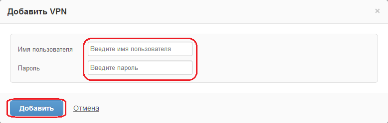 Для того чтобы добавить VPN пользователя нажмите на кнопку Добавить VPN пользователя. В появившемся окне Добавить VPN укажите имя пользователя и пароль в соответствующих полях, затем нажмите на кнопку Добавить (рис. 76).