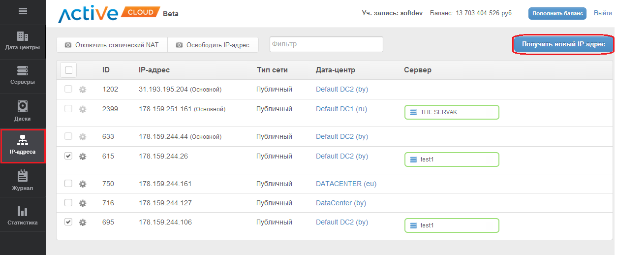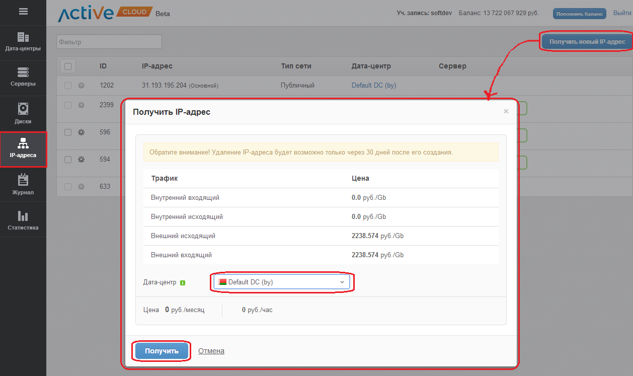 В появившемся окне Получить IP-адрес из выпадающего списка Дата-центр выберите группу серверов (дата-центр), в которой будет создан IP-адрес и нажмите на кнопку Получить (рис. 61).