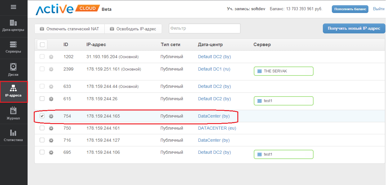 Новый IP-адрес будет добавлен в Вашу виртуальную инфраструктуру и отобразится в таблице со списком всех IP-адресов в рабочей области на главной странице раздела IP-адреса (рис. 62).
