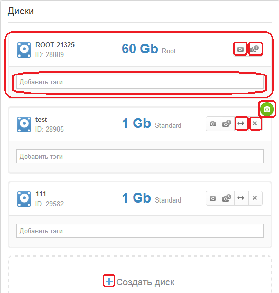 , или отключить существующий диск, нажав на иконку с изображением значка стрелок . Отключение системного диска (ROOT) невозможно.Кроме этого, Вы можете создать снимок образа данных с подключенного диска (снапшот), нажав на иконку с изображением значка фотокамеры