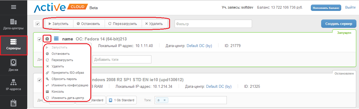 Для того чтобы подключить к серверу ISO-образ, выберите в меню настроек команду Прикрепить ISO-образ. Для того чтобы перенести сервер в другую группу серверов (дата-центр), выберите команду Изменить дата-центр. Для того чтобы удалить сервер из группы серверов (дата-центра), выберите команду меню Удалить.