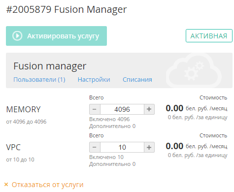 - Ссылка Отказаться от услуги. Процесс отказа от услуги описан в разделе Отказ от услуги «FusionManager».