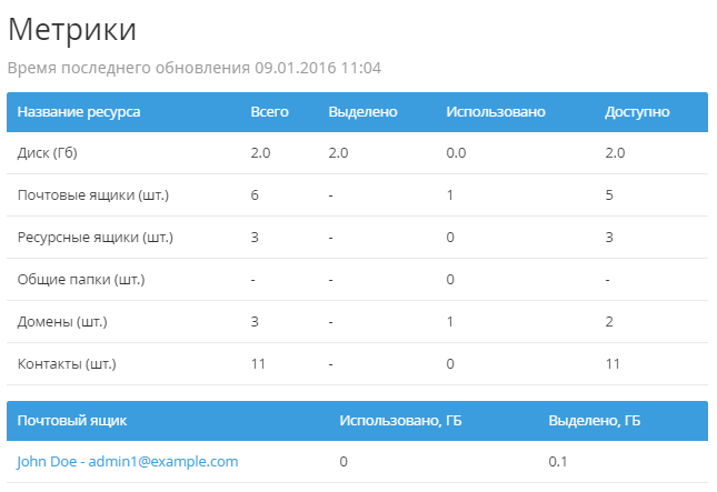 - таблицу с метриками по почтовым ящикам пользователей, которые отображают: