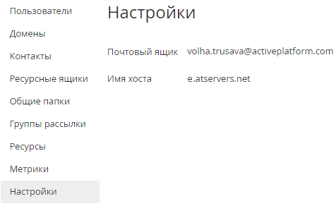 Раздел Настройки предназначен для просмотра реквизитов для настройки почтовых клиентов пользователей, привязанных к данной подписке на услугу «Microsoft Exchange».