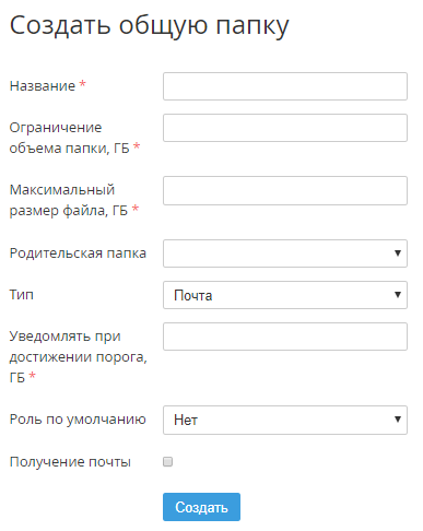 - В поле Уведомлять при достижение порога, ГБ ввести значение, при достижении которого будет высылаться уведомление о достижении порога допустимого объема общей папки.