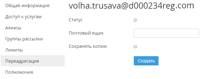- В поле Почтовый ящик ввести почтовый ящик, на который должны переадресовываться письма.