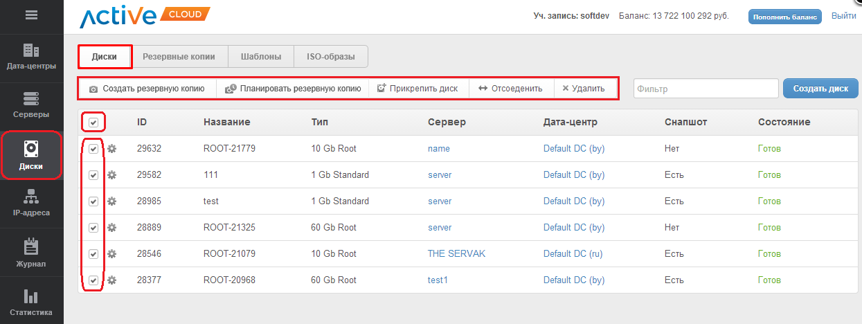 Групповые действия над дисками проводятся при выборе ВСЕХ либо только интересующих дисков посредством кнопок выбора. С их помощью можно применить вышеперечисленные команды одновременно для всех или для нескольких выбранных дисков, не покидая текущей страницы, т.е. без переключения в режим администрирования каждого элемента.