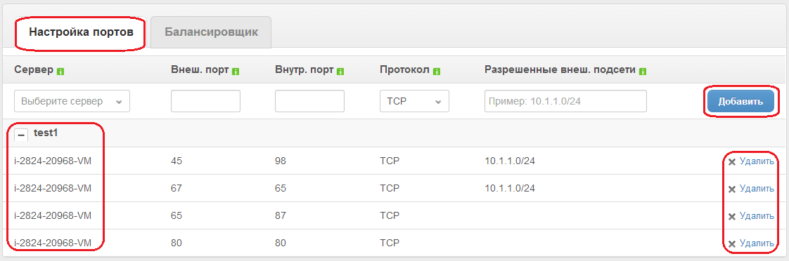 Во вкладке Настройка портов (рис. 66) отображаются все созданные настройки проброса портов между текущим IP-адресом и имеющимися серверами. Здесь Вы также можете добавить новую настройку проброса портов.