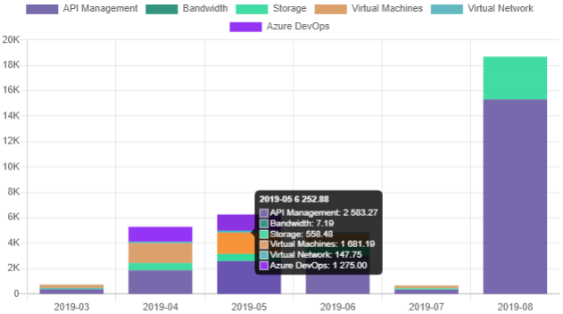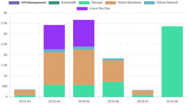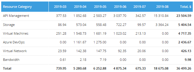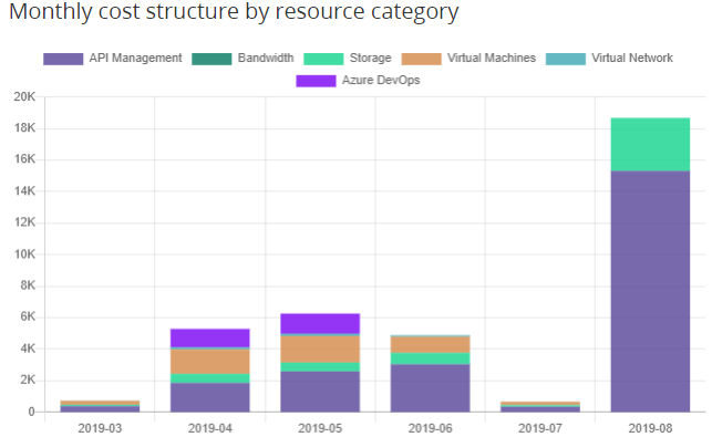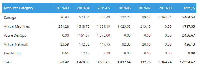 Monthly cost structure by resource category — a stacked bar chart and a table that display the cost structure of the consumed resources by resource categories per month in the selected period. The table also has the total values for every resource category and the grand total for all categories in the selected period. The costs are displayed with up to two decimal places. Months are displayed in the YYYY-MM format.