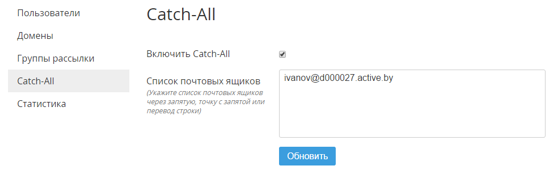 - Отредактировать поле Список почтовых ящиков — ввести адреса электронной почты, на которые будут перенаправляться электронные письма, адресованные несуществующим пользователям.