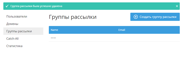 - Нажать кнопку Удалить. На экране отобразится обновленный Список групп рассылок и уведомление «Группа рассылки была успешно удалена».