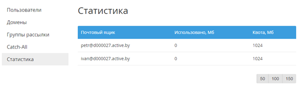 - На экране отобразится Таблица Статистика, содержащая в себе список почтовых ящиков пользователей, привязанных к данной подписке, с указанием доступной квоты и использованного дискового пространства почтового ящика (в Мегабайтах).