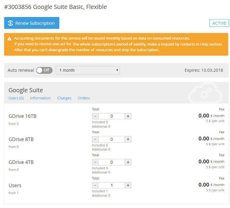 - The Additional Resources management section (see Changing a number of Additional Resources). The Additional Resources management section is available only for the Subscriptions with the Active status during the paid period.