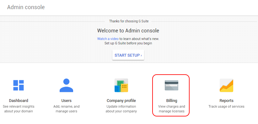 The Billing section is used to manage the Subscription for "Google Suite".