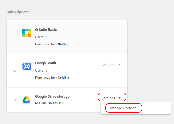During the full period of the flexible Subscriptions, you can either upgrade or downgrade the Subscription Resources. Before downgrading the licenses, go to the G Suite Admin Console and check the amount of unassigned licenses. You can downgrade the Users Resource only by the amount of unassigned licenses. You can remove the licenses if required (see Assign, remove, and reassign licenses). You can downgrade the Resource only by the amount of unassigned licenses (see an example below on how to view the amount of licenses).