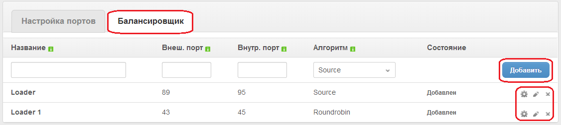 Для того чтобы удалить балансировщик, нажмите на иконку с изображением значка крестика  напротив балансировщика, который Вы хотите удалить.