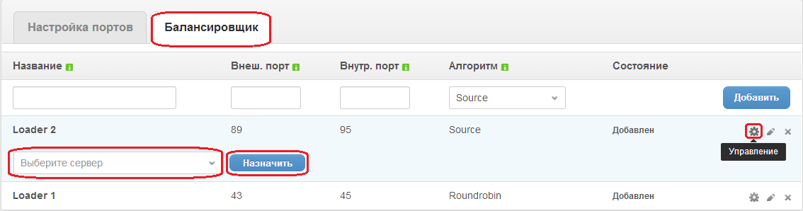 Для того чтобы подсоединить балансировщик к серверу нажмите на иконку с изображением значка шестеренки  справа от балансировщика. Из выпадающего списка выберите сервер и нажмите на кнопку Назначить (рис. 68).