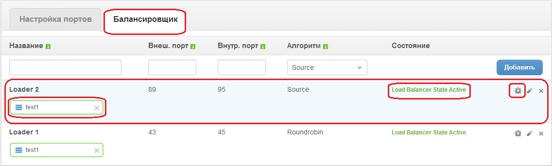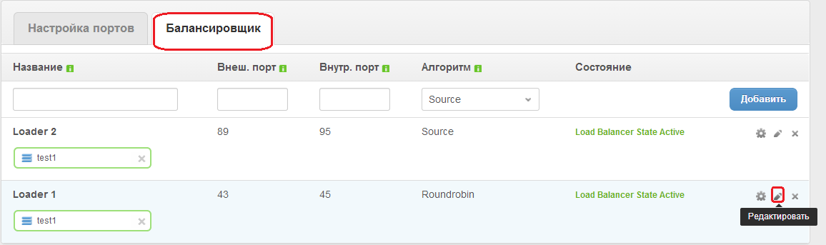 Для созданных балансировщиков Вы можете назначить сервер, отредактировать алгоритм распределения нагрузки и название балансировщика.