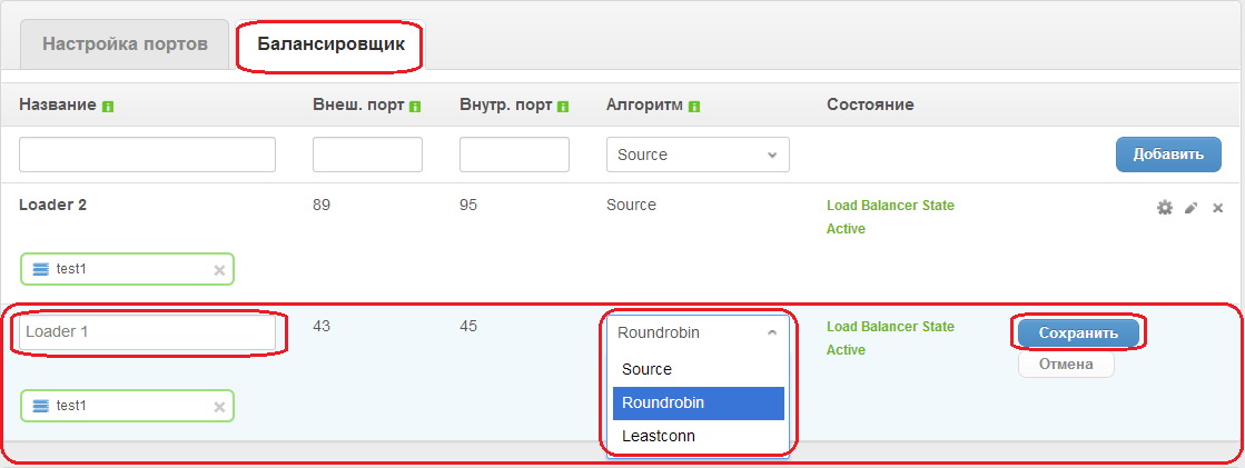 Здесь Вы также можете задать алгоритм действия для нового балансировщика, который хотите настроить для текущего IP-адреса. Для этого в поле «Название» введите имя для балансировщика в произвольном формате, в соответствующих полях укажите внутренний и внешний порты, между которыми будет происходить обмен запросами.