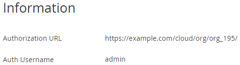 The Information page includes the instruction how to get access to the vCloud Director Control Panel and the following elements:Authorization URL — vCloud Director Control Panel URL.