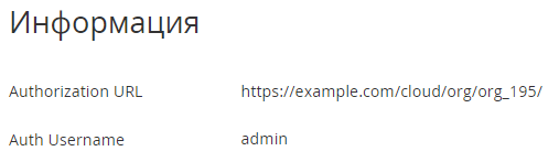 - Auth Username (Логин администратора организации) — имя пользователя для входа в Панель управления vCloud Director.