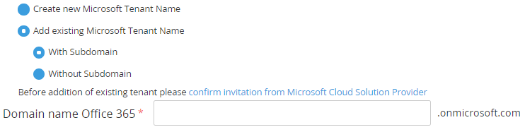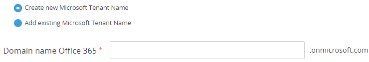 If in the settings for the Office365 plugin for the Microsoft Azure service the Disable new Tenant creation checkbox is selected, the Create new Microsoft Tenant Name option is unavailable and by default, the Add existing Microsoft Tenant Name > With Subdomain option is selected.