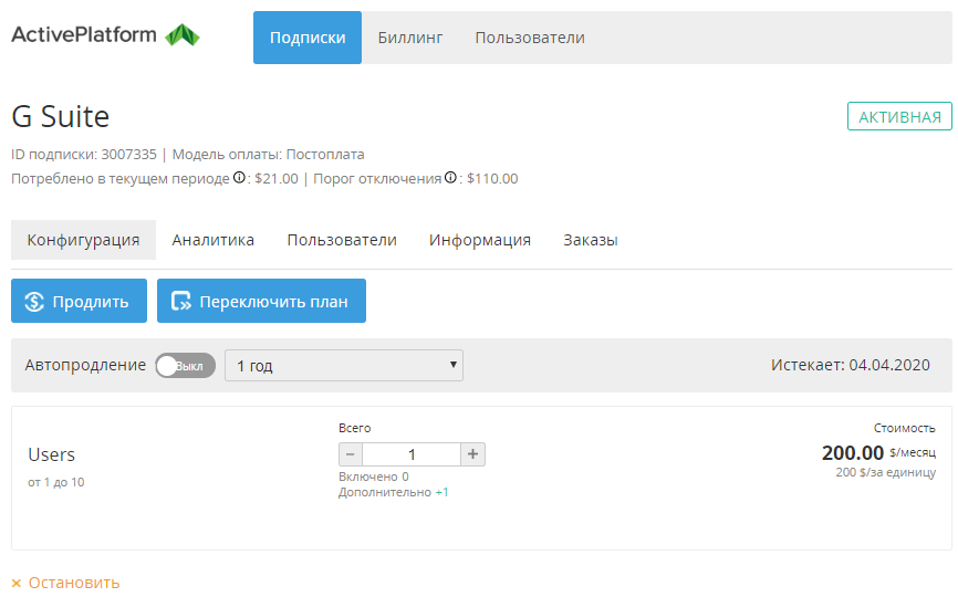 Кнопка Остановить (см. Остановка подписки). Недоступно для Подписок на годовые Тарифные планы с помесячной оплатой.
