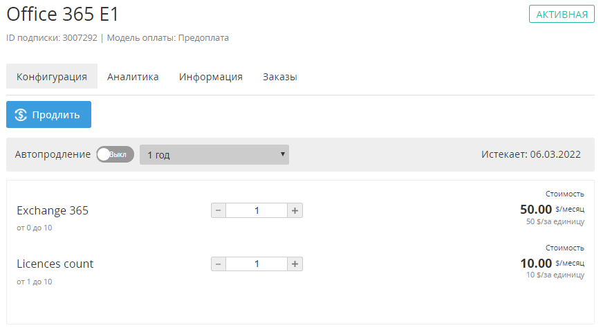 Раздел Конфигурация предназначен для управления Подпиской на Услугу «Microsoft Office 365».