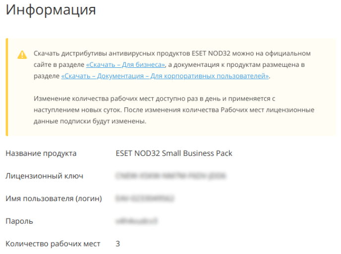 При изменении количества рабочих мест (см. ESET NOD32. Изменение количества Ресурса Подписки) необходимо будет ввести новые лицензионные данные, которые появятся в ESET NOD32. Раздел «Информация», а также будут высланы на электронную почту, указанную при регистрации.