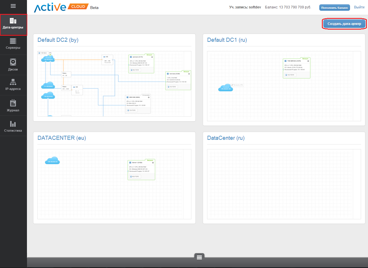 Для того чтобы создать группу серверов (дата-центр) нажмите на кнопку Создать дата-центр в верхнем правом углу рабочей области раздела Дата-центры (рис. 5):