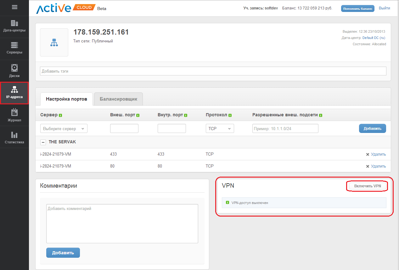 Область VPN предназначена для подключения доступа к виртуальной частной сети (Virtual Private Network). Для того чтобы предоставить пользователю доступ к виртуальной сети нужно подключить VPN доступ. Для этого в панели администрирования выбранного IP-адреса нажмите на кнопку Включить VPN (рис. 74).