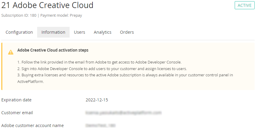 The Information section contains information credentials to access Adobe Admin Console and Subscription activation instruction.