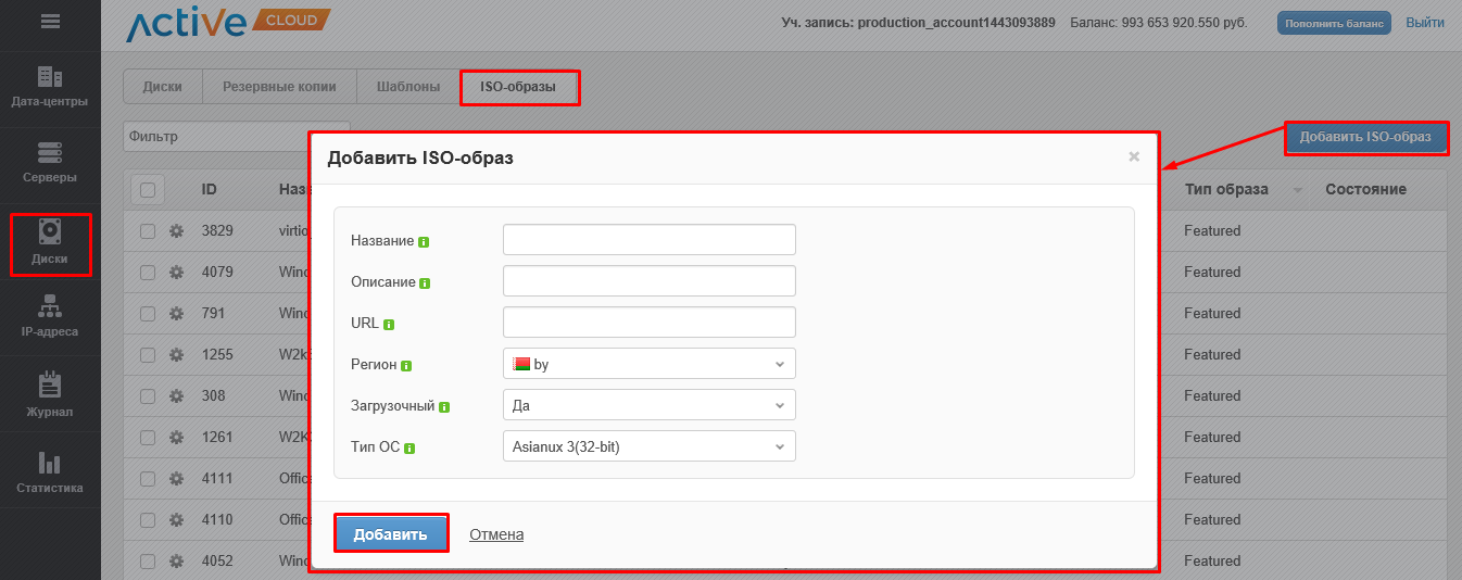 В появившемся окне Добавить ISO-образ введите название для ISO-образа в поле Название в произвольном формате. Введите описание для ISO-образа в произвольном формате в соответствующее поле. Укажите URL адрес, с которого будет скачан ISO-образ, в поле URL.
