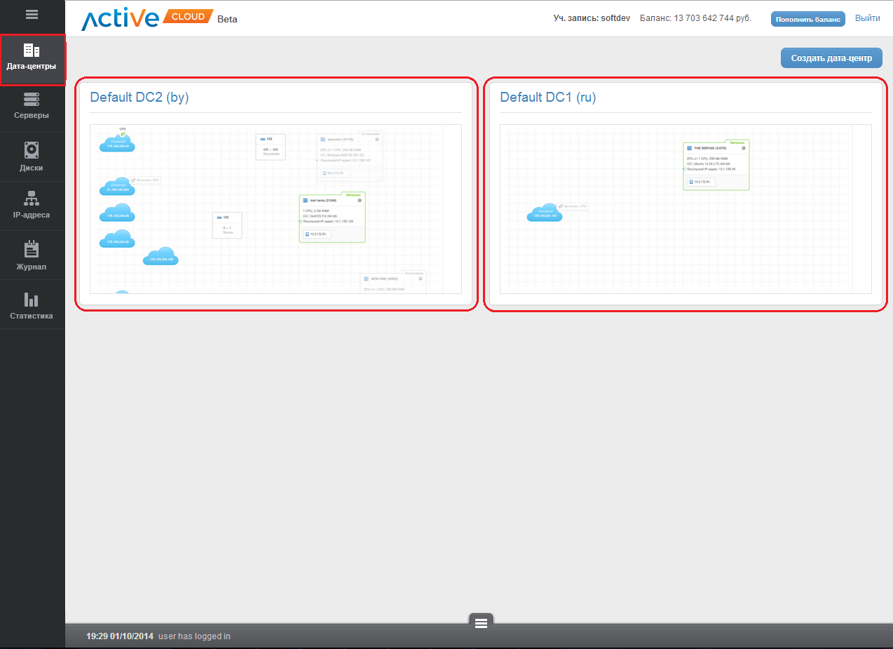 Для того чтобы попасть в раздел Дата-центры выберите меню Дата-центры в Навигационном меню. Данный раздел позволяет пользователю создавать и управлять серверами, которые объединены в группы (дата-центры). Созданные группы серверов (дата-центры) отображаются в основной рабочей области в виде графических изображений (скриншотов):