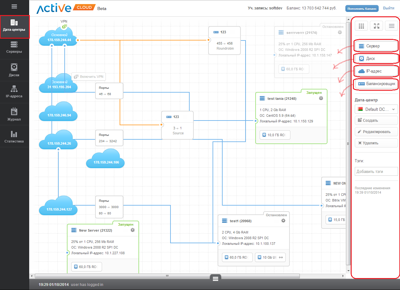Нажав на скриншот или имя-ссылку определенной группы серверов (дата-центра), Вы попадете в режим редактирования, в котором можно вносить изменения в выбранную группу серверов (дата-центр), а также добавлять новые элементы инфраструктуры (серверы, сети, диски, порты, балансировщики) путем перетаскивания нужного Вам элемента из панели инструментов в рабочую область панели управления:
