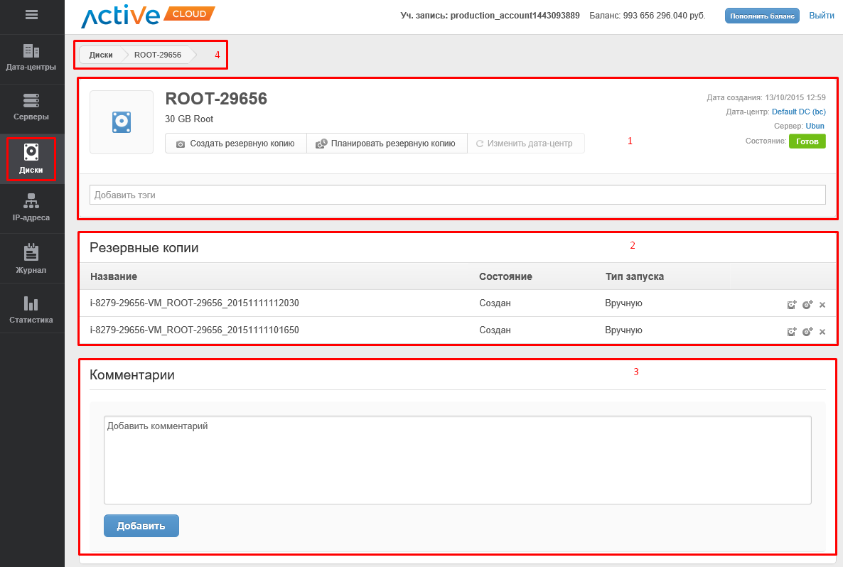 В области информации и основных элементов управления диском отображается имя и производительная мощность диска; дата создания диска и группа серверов (дата-центр), в которой размещен данный диск; информация о текущем состоянии диска (Выделен/Готов).