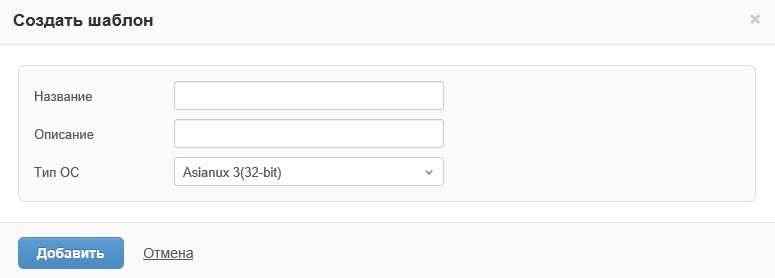 Для того чтобы создать шаблон на основе копии диска, нажмите на иконку  . В появившемся окне Создать шаблон введите Название и Описание для нового шаблона в соответствующие поля. Из выпадающего списка Тип ОС выберите тип операционной системы, которая будет установлена для шаблона. Нажмите Добавить.