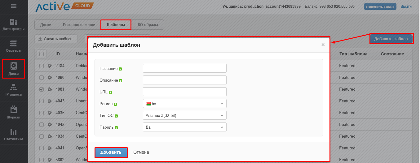 В появившемся окне Добавить шаблон введите название для нового шаблона в поле Название в произвольном формате. Введите описание для шаблона в произвольном формате в соответствующее поле. Укажите URL адрес, с которого будет скачен шаблон, в поле URL.