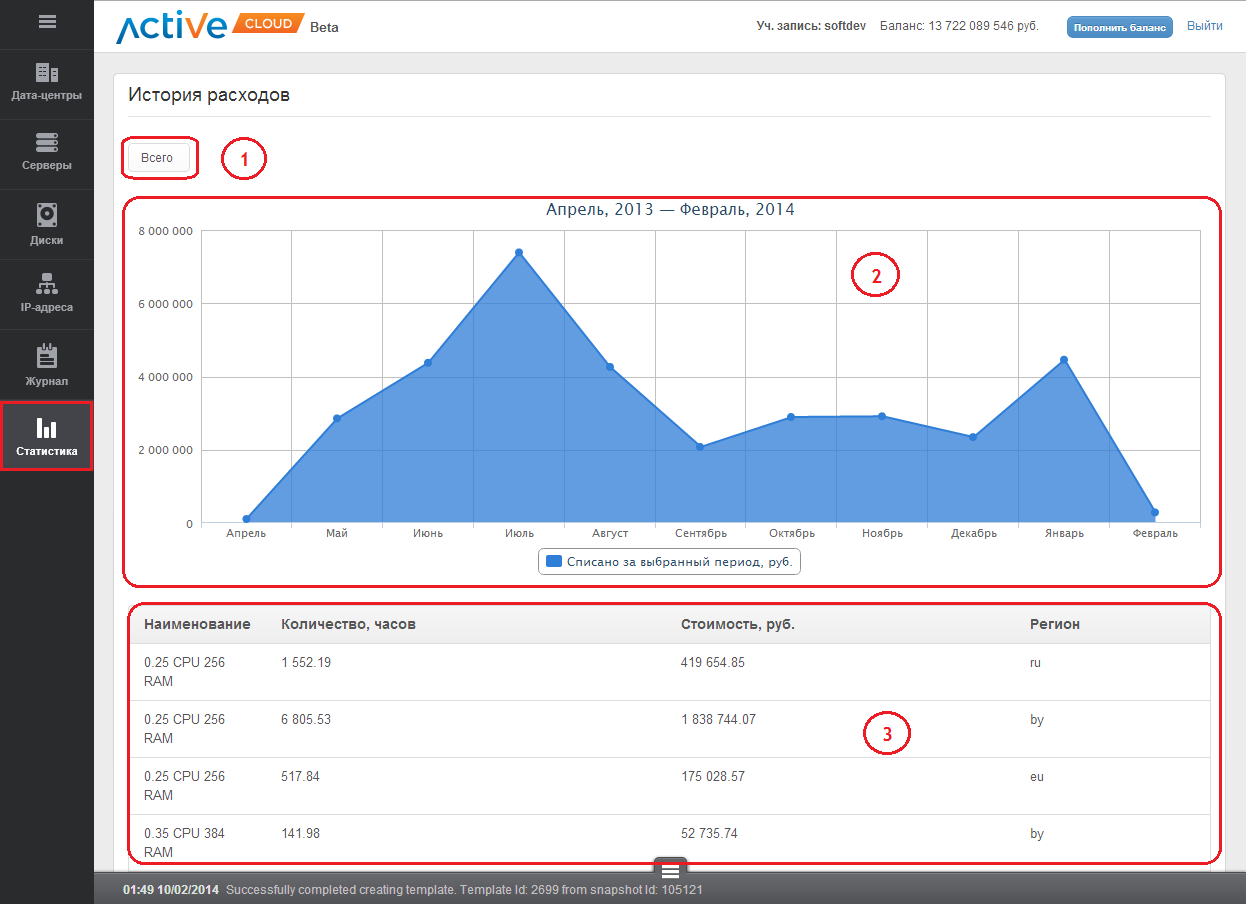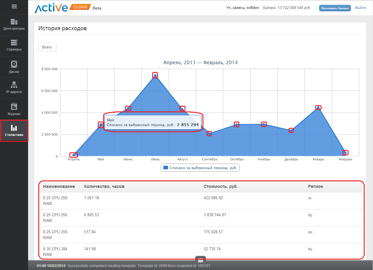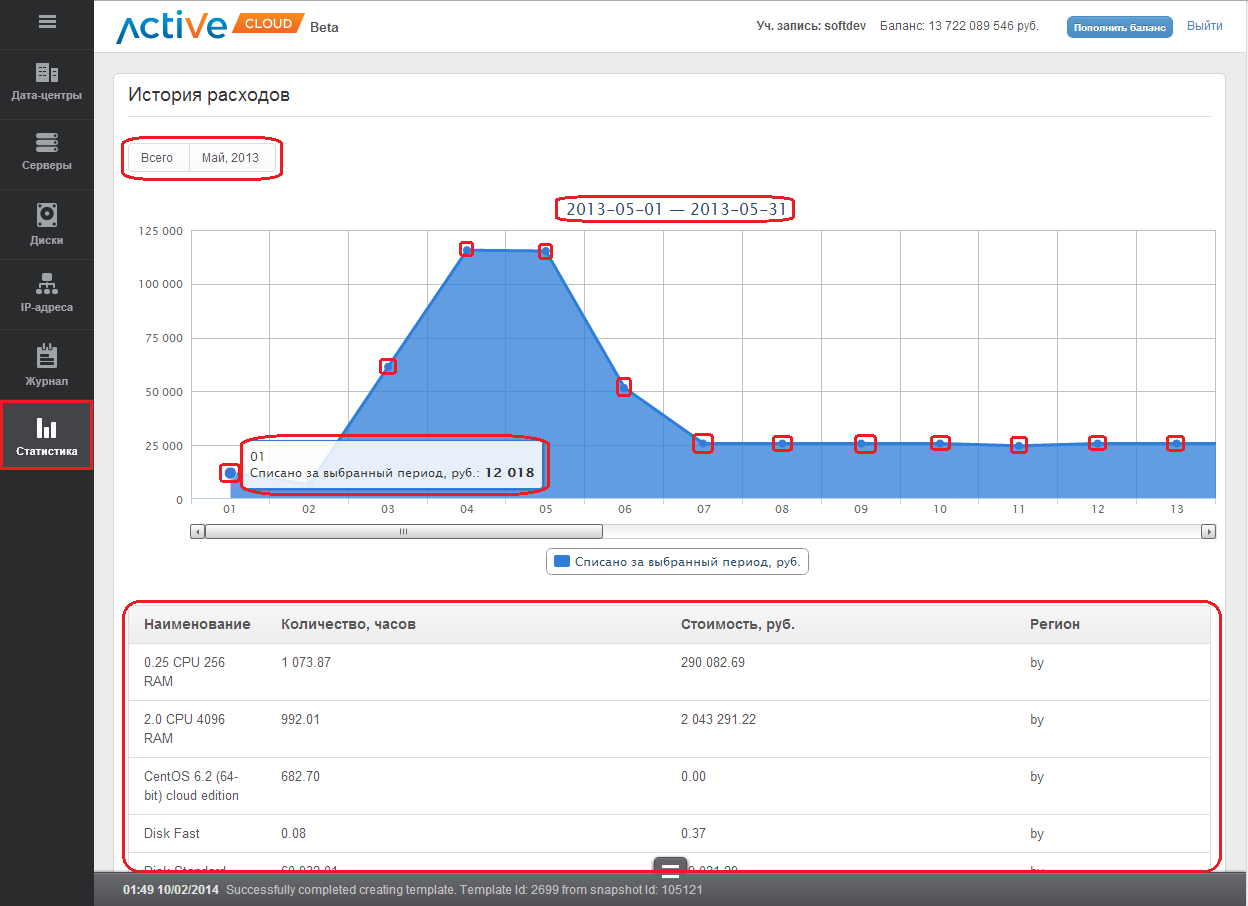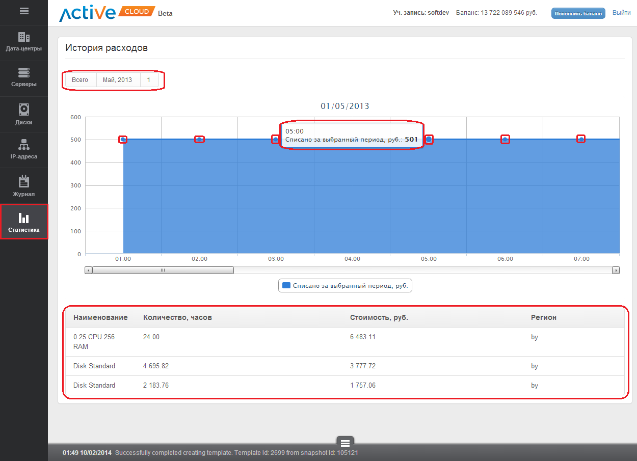 Вы можете просмотреть график и историю расхода ресурсов за весь период использования сервиса CloudServer (IaaS), за интересующий Вас месяц, день и час, а также узнать подробную информацию по количеству и стоимости использованных ресурсов.