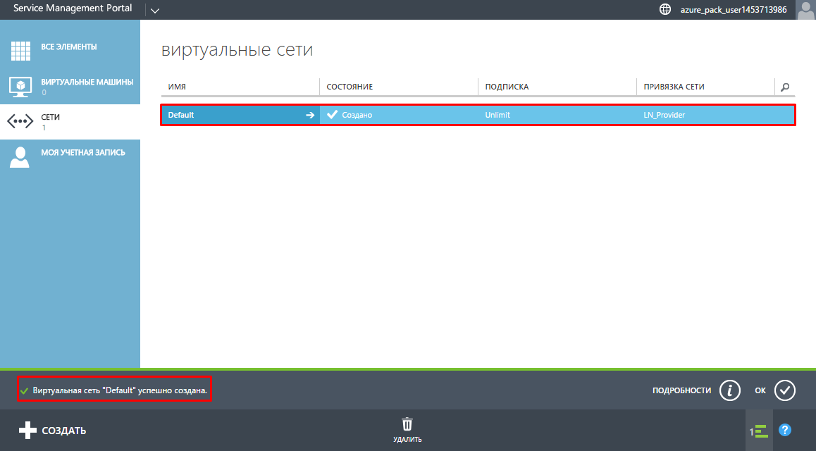 Статус создания виртуальной сети отобразится внизу экрана, а новая сеть будет добавлена в список "Виртуальные сети".