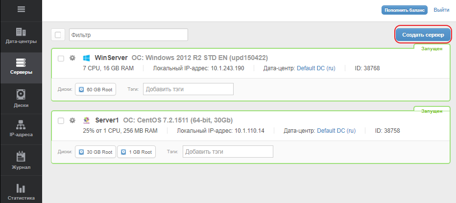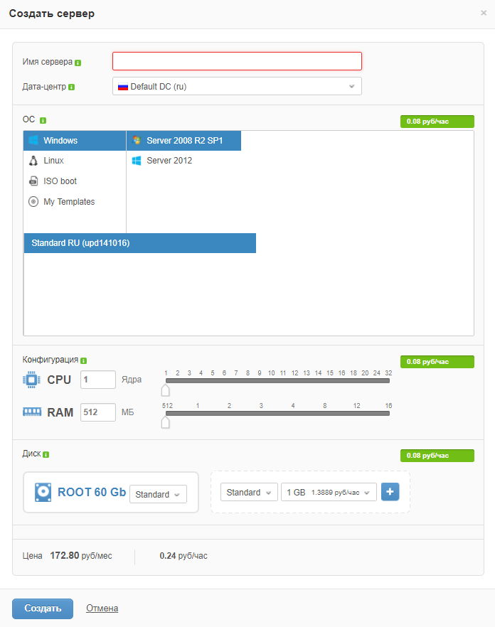 Стоимость аренды сервера складывается из стоимости лицензии на ОС, стоимости конфигурации сервера, стоимости корневого диска и стоимости дополнительного диска. Итоговая стоимость в месяц (30 дней) и в час указана слева от надписи Цена внизу окна.- Нажмите кнопку Создать. Новый сервер добавится в систему, а его графическое изображение появится в рабочей области главной страницы раздела Серверы.