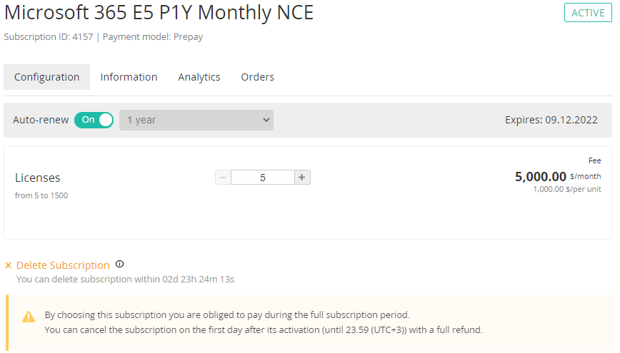 Deleting the Subscription is available within a limited period after its activation. Next to the Delete subscription button, the countdown timer is displayed. When the period expires, the button and timer disappear, and deleting the Subscription becomes unavailable. Also, for P1Y Annual and P1M Monthly Subscriptions, Charges for the whole period are closed.