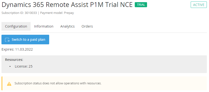- The Switch to a paid plan button is only available for trial Subscriptions before they expire (see Microsoft NCE. Switching to a paid Plan).