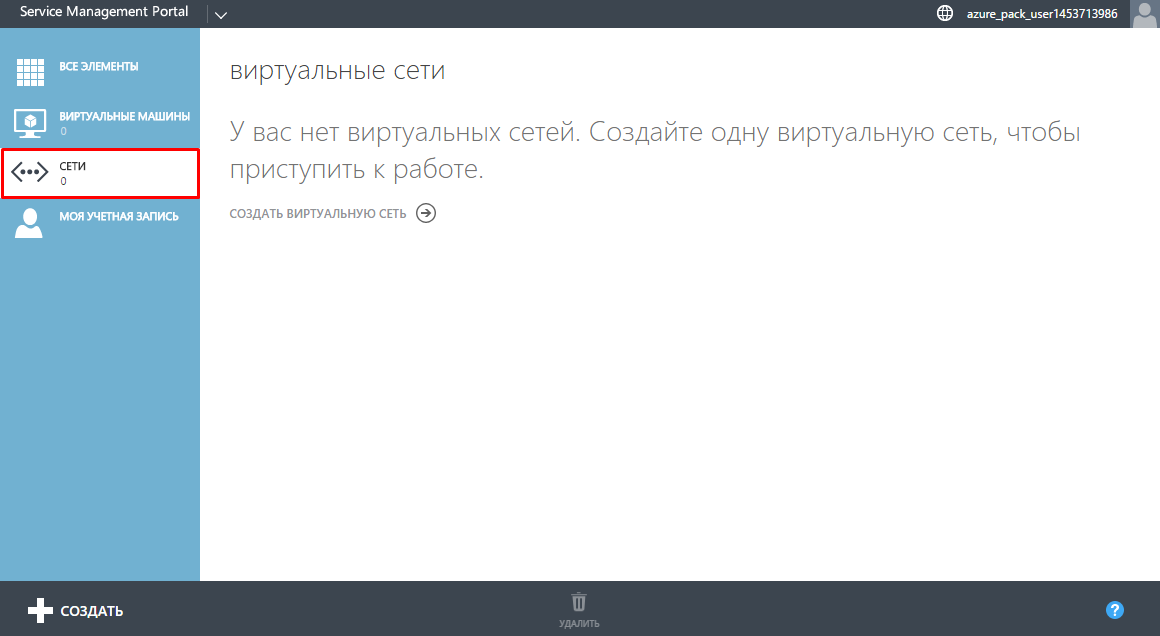 - Выберите в левой части экрана раздел "Сети" и нажмите на ссылку "+ СОЗДАТЬ" в левом нижнем углу экрана. При создании виртуальной сети впервые, в рабочей области экрана доступна ссылка "Создать виртуальную сеть";