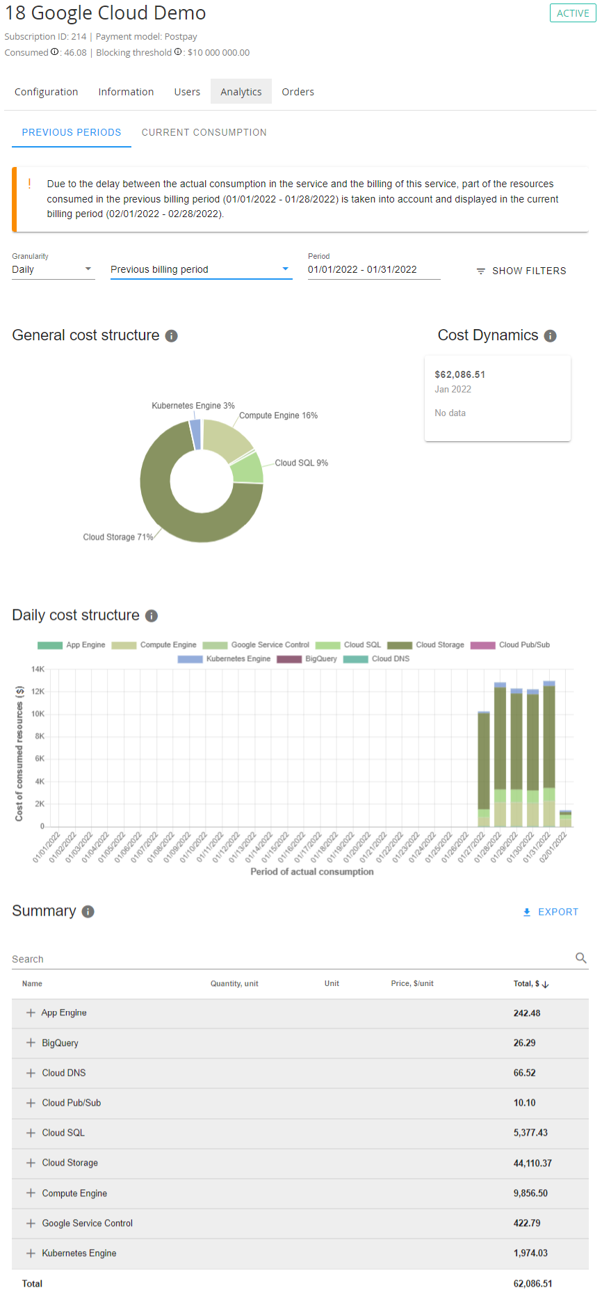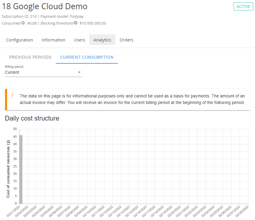 - Information about consumed Resources is available in the Daily cost structure bar chart only. All bars are displayed in grey because there is no data per Resource categories and Resources. At the beginning of the next Billing period Google provides detailed consumption data. The draft Charges are deleted, and the final Charges are generated. The final detailed consumption data is displayed on the Previous periods tab.