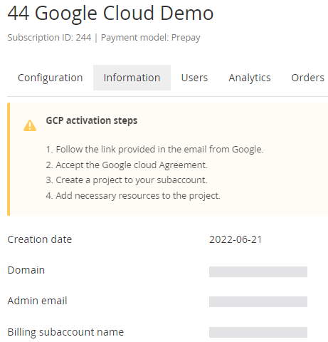 The Information section contains information credentials to access Google Cloud Console and Subscription activation instruction.