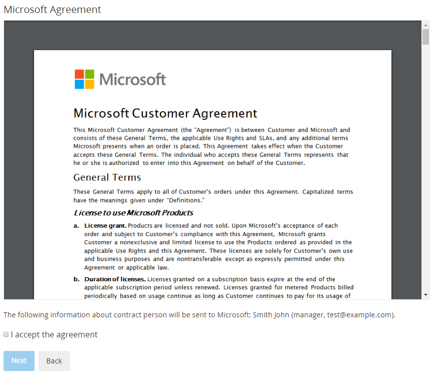 - Accept the Microsoft agreement. If a selected Resource requires the acceptance of the Microsoft Customer Agreement, the Microsoft Agreement page is displayed. On this step: