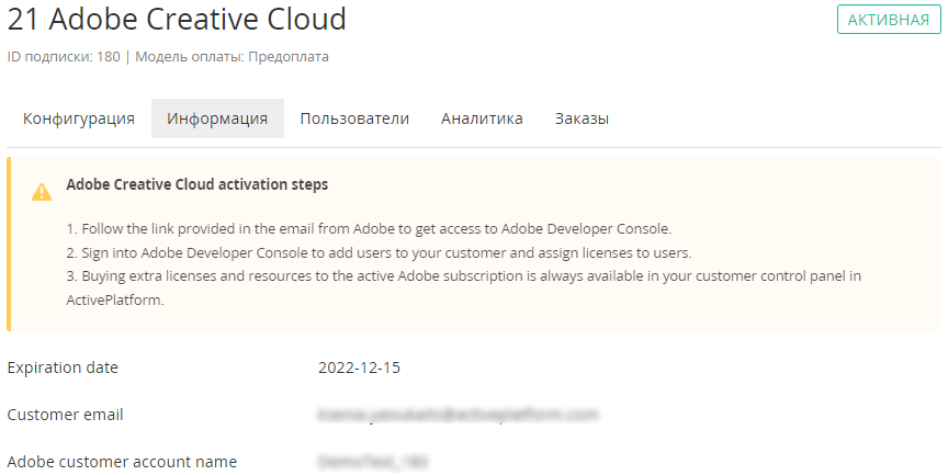 - Дата истечения подписки — общая дата истечения лицензий Клиента на продукты Adobe.