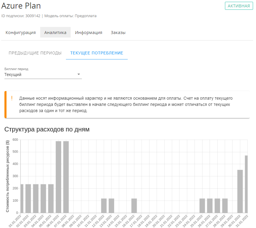 Для Услуги Microsoft Azure Plan в разделе Аналитика информация о потреблении доступна на двух вкладках: