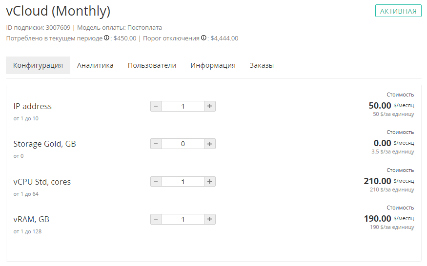 - Блок управления Ресурсами (подробнее см. Изменение количества ресурсов). Блок управления Ресурсами доступен только для активных Подписок во время тарифицируемого периода. Во время пробного периода изменение количества Ресурсов не предусмотрено.